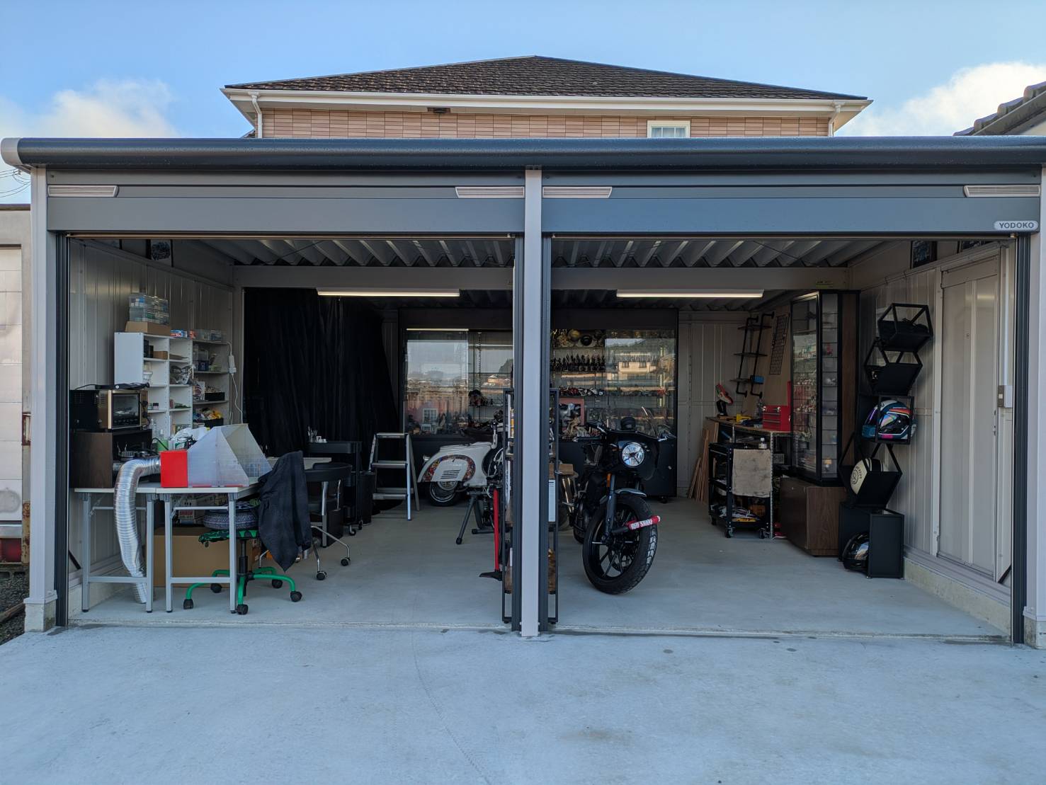 念願のバイク&造形制作ガレージが完成しました。縦5500×横5500×高2200とちょうど良いサイズ感です。贅沢を言えばもう少し大きいスペースが欲しかったのですが、広ければ広いほどモノを沢山所有してしまうのは還暦を迎えた私としては自粛し徐々に断捨離していかないと・・・。